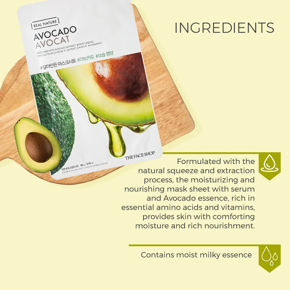 THEFACESHOP Real Nature Avocado Mask es una mascarilla de tejido intensamente nutritiva e hidratante, formulada con extracto de aguacate, un ingrediente rico en ácidos grasos, vitaminas y antioxidantes que ayudan a suavizar, fortalecer y revitalizar la piel. Es perfecta para pieles secas, deshidratadas o apagadas que necesitan un impulso de nutrición y confort inmediato.