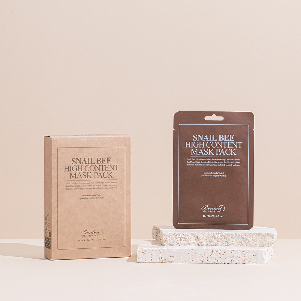 Benton Snail Bee High Content Mask Pack 20 g (1 ud) es una mascarilla reparadora, calmante e hidratante, diseñada para mejorar la elasticidad, suavizar la textura y aportar confort inmediato a pieles sensibles, apagadas o con tendencia a irritarse. Su fórmula combina mucina de caracol y veneno de abeja para revitalizar la piel y reforzar la barrera cutánea.