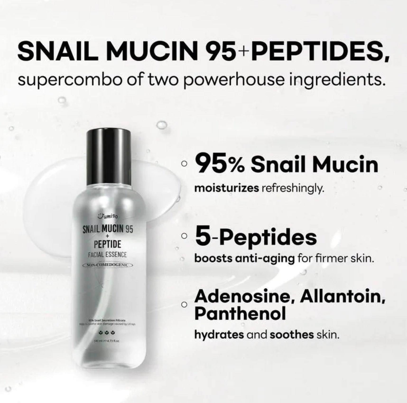 Jumiso Snail Mucin 95 + Peptide Essence (50 ml) es una esencia ligera, reparadora y reafirmante, formulada con un 95% de mucina de caracol y un complejo de péptidos que ayudan a mejorar la elasticidad, suavizar la textura y fortalecer la barrera cutánea. Su textura es fluida y fresca, perfecta para pieles que buscan hidratación profunda sin sensación pesada.
