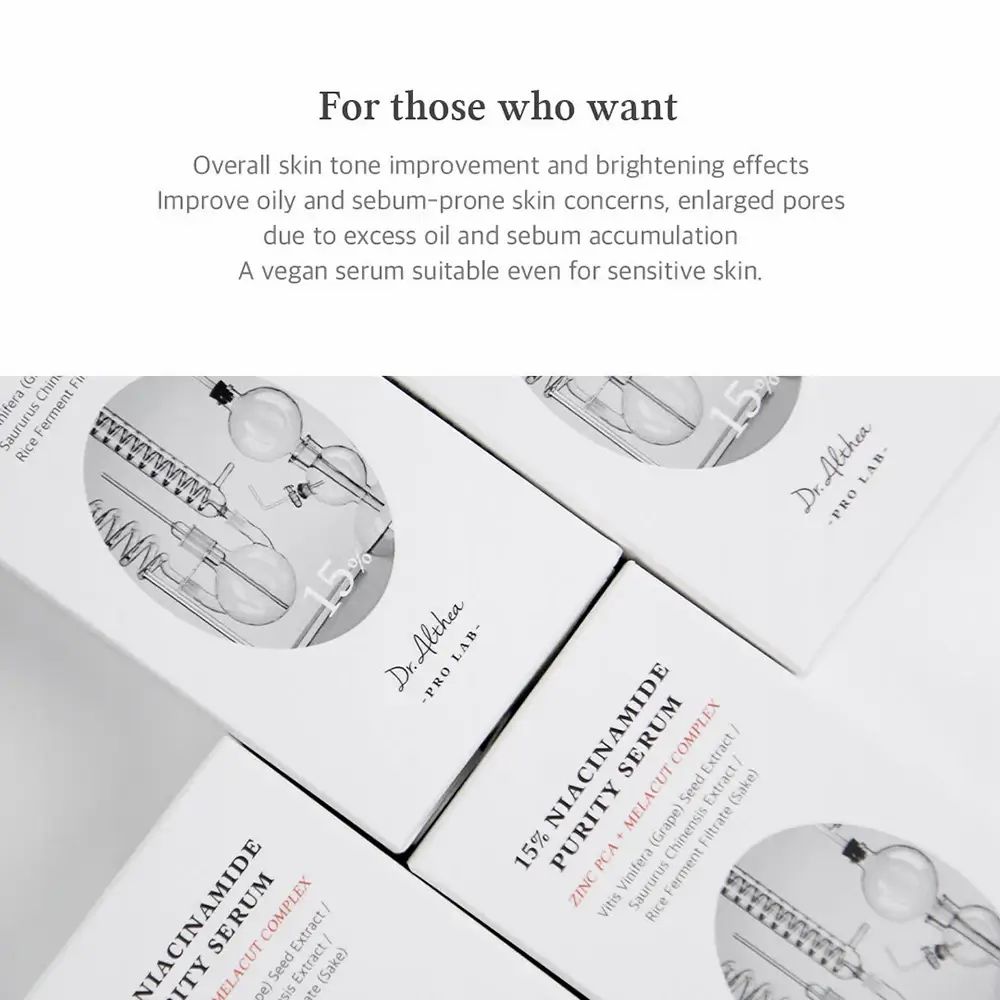 Dr. Althea 15% Niacinamide Purity Serum (30ml) es un sérum concentrado diseñado para mejorar el tono desigual, reducir manchas, controlar el exceso de sebo y fortalecer la barrera cutánea. A pesar de su alta concentración, está formulado para minimizar la irritación y ser apto para pieles mixtas, grasas o con tendencia a brotes.