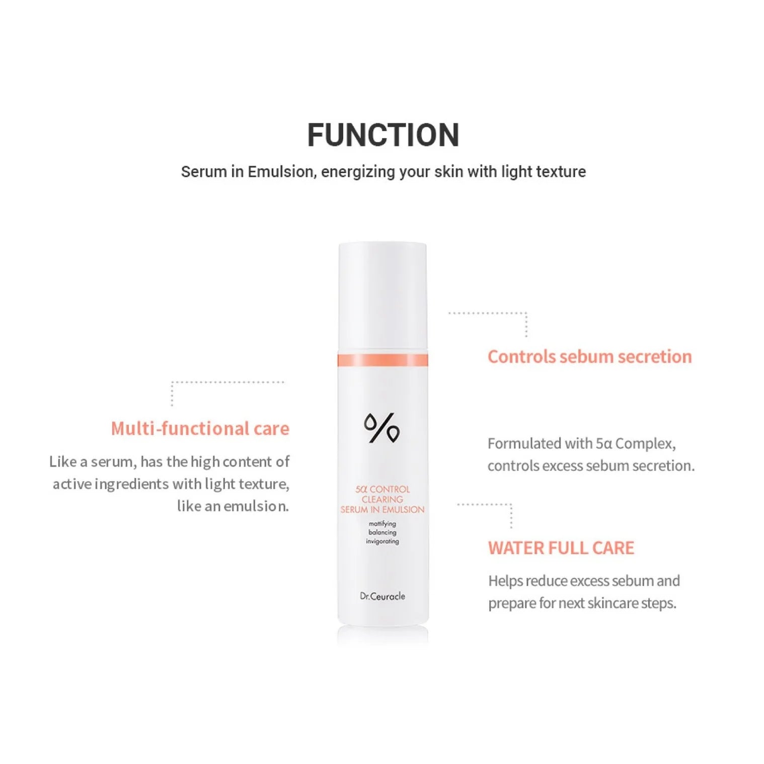 Dr.Ceuracle 5α Control Clearing Serum in Emulsion es un sérum‑emulsión equilibrante diseñado para tratar imperfecciones, regular el exceso de sebo y mejorar la textura de la piel sin resecarla. Su fórmula combina el exclusivo 5α Complex con ingredientes calmantes e hidratantes, logrando un tratamiento completo que actúa como sérum y como hidratante ligero al mismo tiempo.