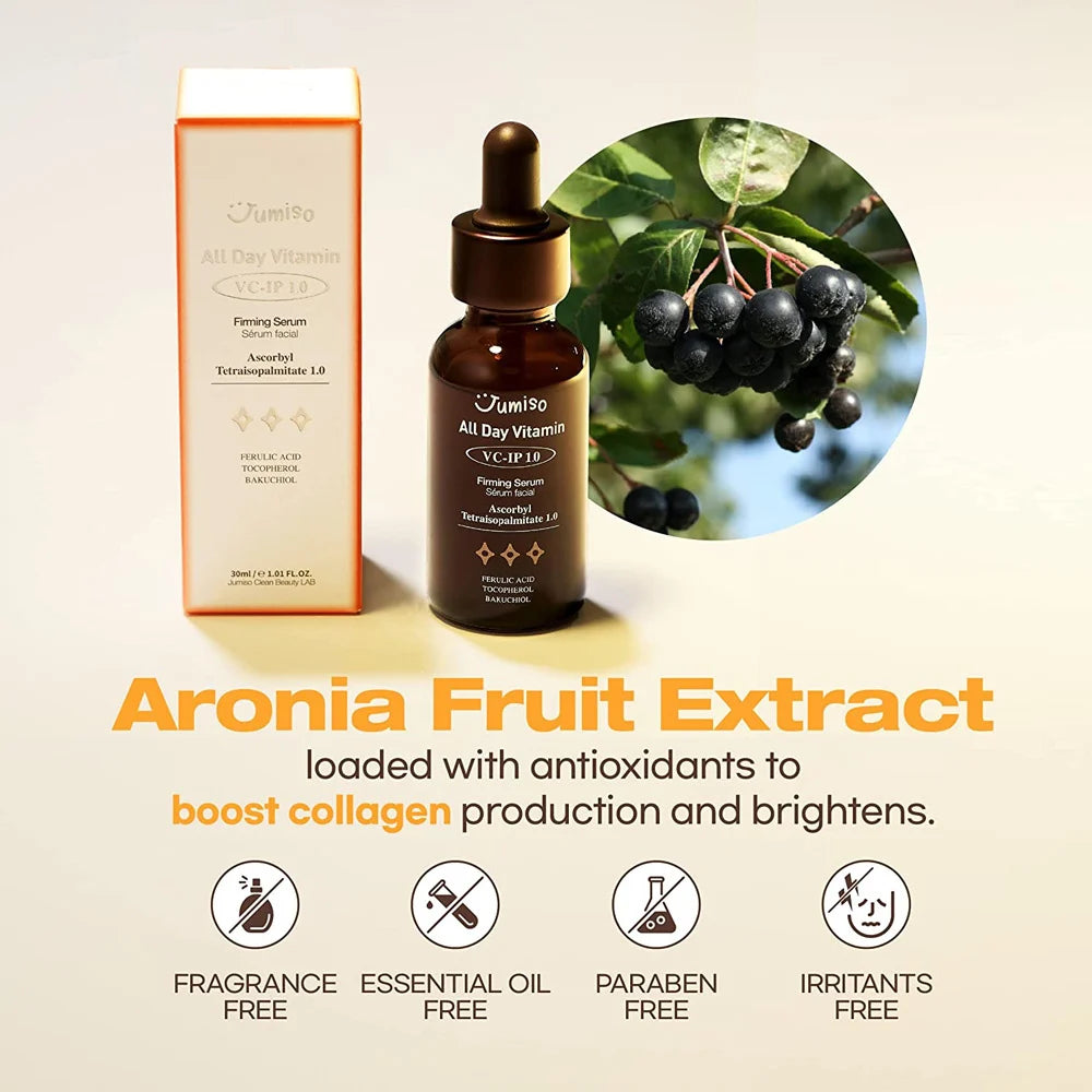 Jumiso All Day Vitamin VC‑IP 1.0 Firming Serum (30 ml) es un sérum reafirmante, iluminador y antioxidante, formulado con vitamina C liposoluble (VC‑IP) al 1% para mejorar la firmeza, unificar el tono y aportar un glow saludable sin irritación. Su textura es ligera, sedosa y de rápida absorción, ideal para pieles que buscan luminosidad y efecto tensor diario.
