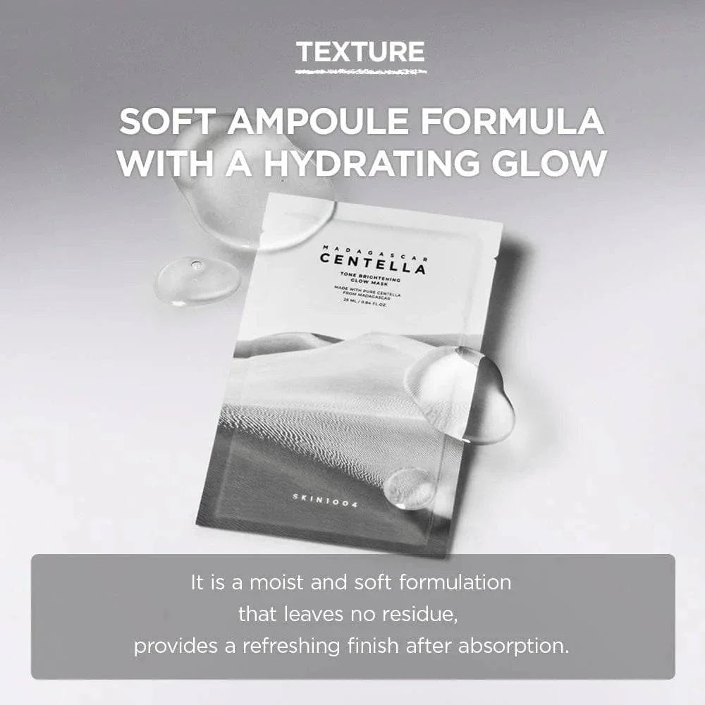 Skin1004 Madagascar Centella Tone Brightening Glow Mask es una mascarilla iluminadora, calmante y perfeccionadora, diseñada para aportar un glow saludable mientras unifica el tono y mejora la textura de la piel. Combina la suavidad reparadora de la Centella Asiática de Madagascar con un complejo iluminador que ayuda a revitalizar pieles apagadas o con manchas leves.