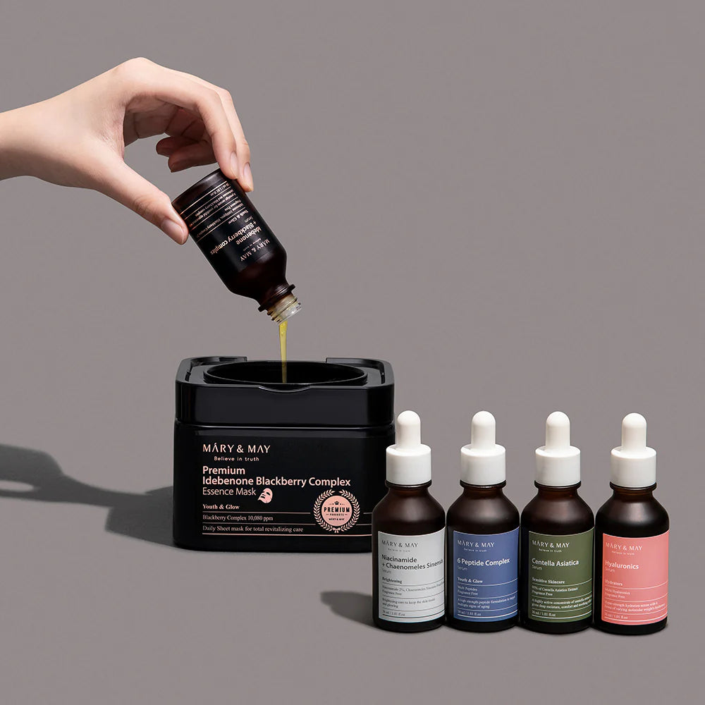Mary&May Premium Idebenone Blackberry Complex Essence Mask (20EA) es un set de mascarillas faciales intensivas, diseñadas para iluminar, reafirmar y revitalizar la piel gracias a una combinación potente de idebenona y extracto de mora. Cada mascarilla está impregnada con una esencia rica en antioxidantes que ayuda a mejorar la elasticidad y el tono de la piel.